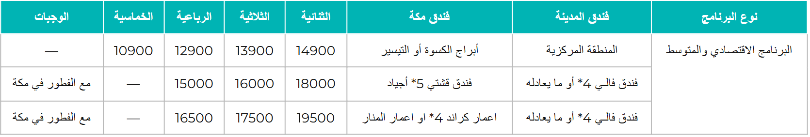 | مع الفطور في مكة | — | 16500 | 17500 | 19500 | اعمار كراند 4* او اعمار المنار | فندق فالـي 4* أو ما يعادله |