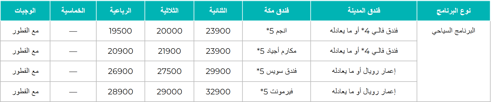 | الوجبات | الخماسية | الرباعية | الثلاثية | الثنائية | فندق مكة | فندق المدينة | نوع البرنامج |